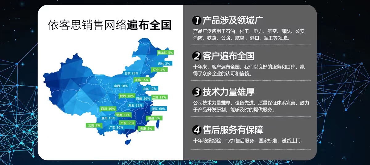 依客思防爆專注于防爆產(chǎn)品的研發(fā)、生產(chǎn)與銷售,主要產(chǎn)品有:防爆操作柱、BXCQ防爆靜電釋放儀、BZC系列防爆操作柱、不銹鋼現(xiàn)場操作箱、BXM(D)防爆照明(動力)配電箱、BXX防爆檢修箱、BXJ防爆接線箱、LED防爆燈、防爆管件、防爆風(fēng)機等產(chǎn)品,型號規(guī)格齊全,廣泛適用于煤炭、電力、醫(yī)藥、石油、化工、航空等領(lǐng)域。我公司產(chǎn)品質(zhì)量過硬,價格實惠,銷售范圍廣,且與各大型企業(yè)建立了良好的合作關(guān)系,同時還遠銷中、東亞和北美等地區(qū),深受用戶喜愛與青睞。如有需要請留意,稍后將有客服與您聯(lián)系